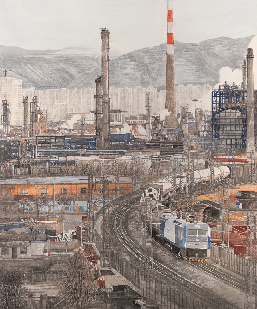 吴争真是获奖作者中年纪最小的一位,她凭借中国画《复兴之路》中蒸蒸日上的场景描绘,获得了评委的青睐。其创作灵感来自穿行于华师大闵行校区校园的铁路线,融合采风与生活积累,以新工笔风格的淡彩呈现祖国的欣欣向荣。画面中心,一辆货运火车疾驰而来,其后,是拔地而起的高楼大厦。“作品从构思到完成花了近两个月时间,所绘内容并没有特指某个城市,而是希望展示我们国家的整体发展态势。”